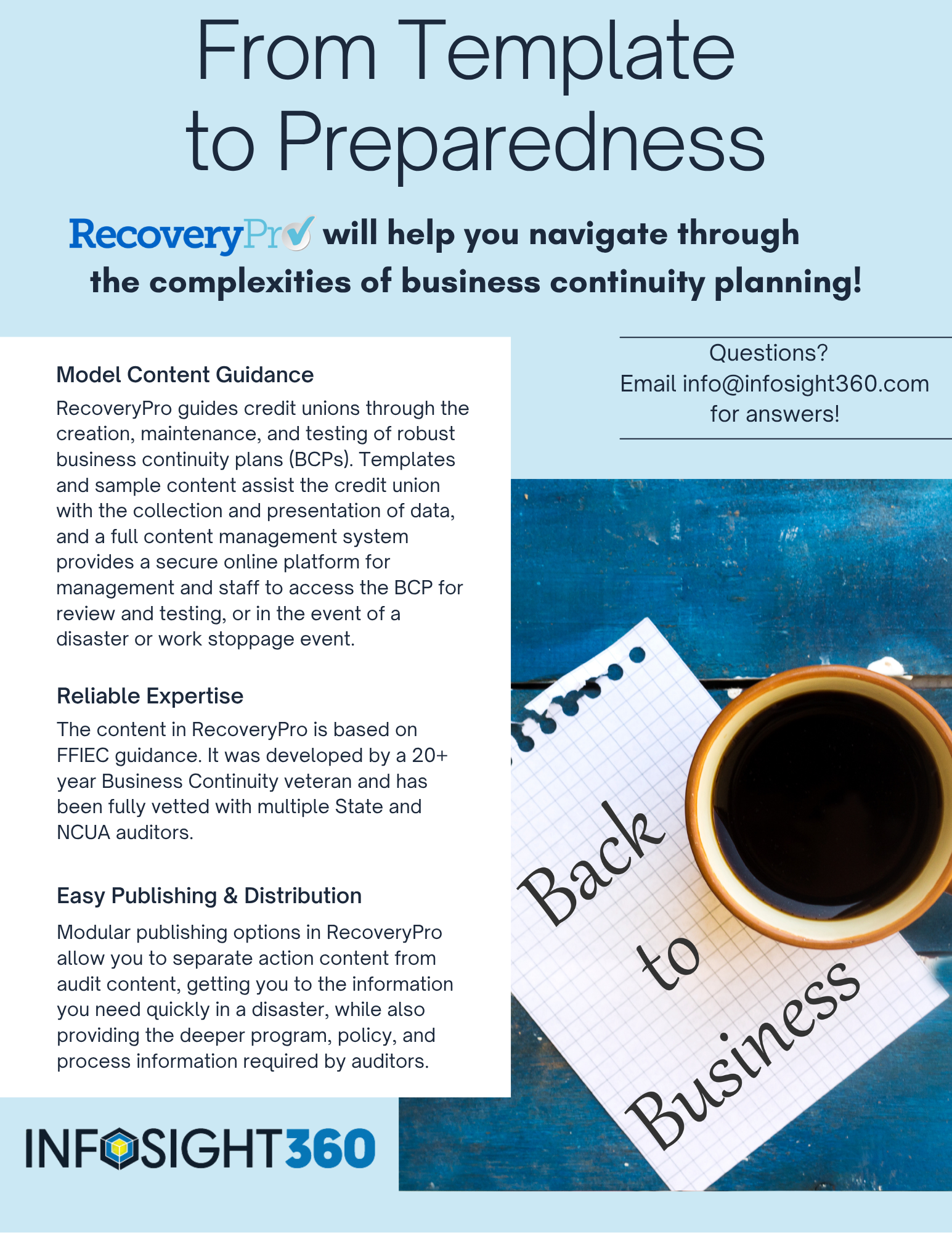 RecoveryPro’s model content and plan guidance will help your credit unions develop Business Continuity Plan (BCP) goals and objectives, prepare a team, and formulate and activate the plan. Develop business impact analyses to help prioritize business processes and assess risks and impacts of a variety of event types.